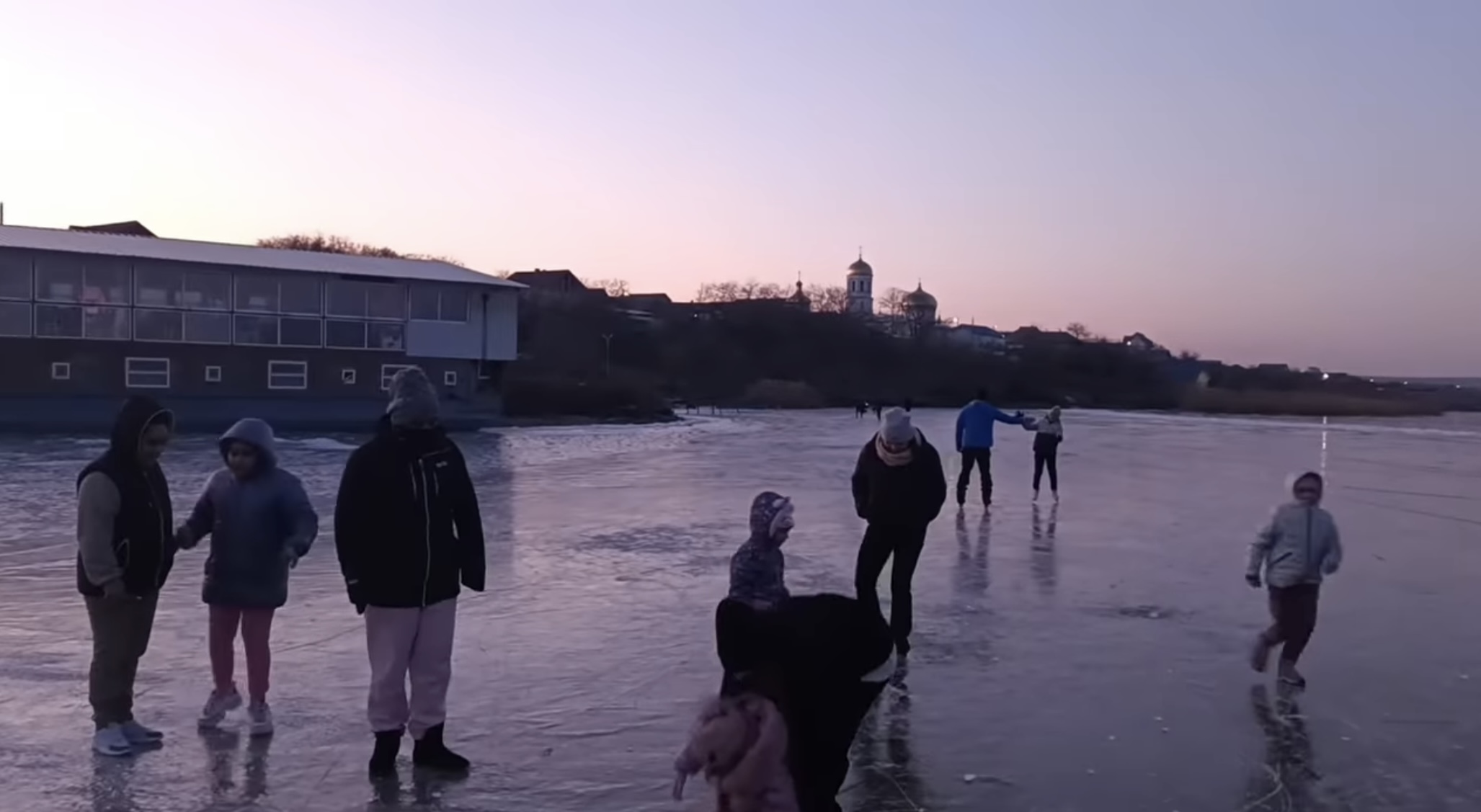 Imagini filmate de un localnic și postate aseară pe o rețea de socializare arată cum copii, tineri și adulți alunecă pe suprafața înghețată a lacului.