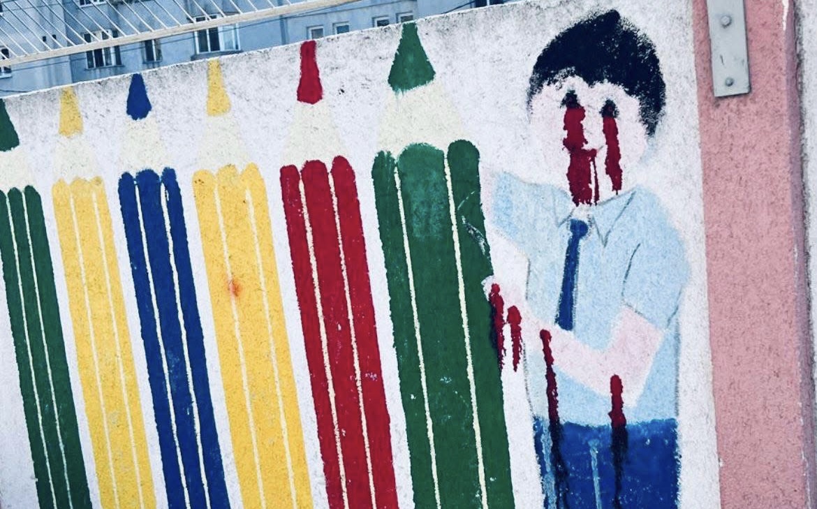 În pictura de pe zidul respectiv era desenat un elev, căruia i-au fost adăugate însă mai multe pete roșii, transformând imaginea într-una sinistră.