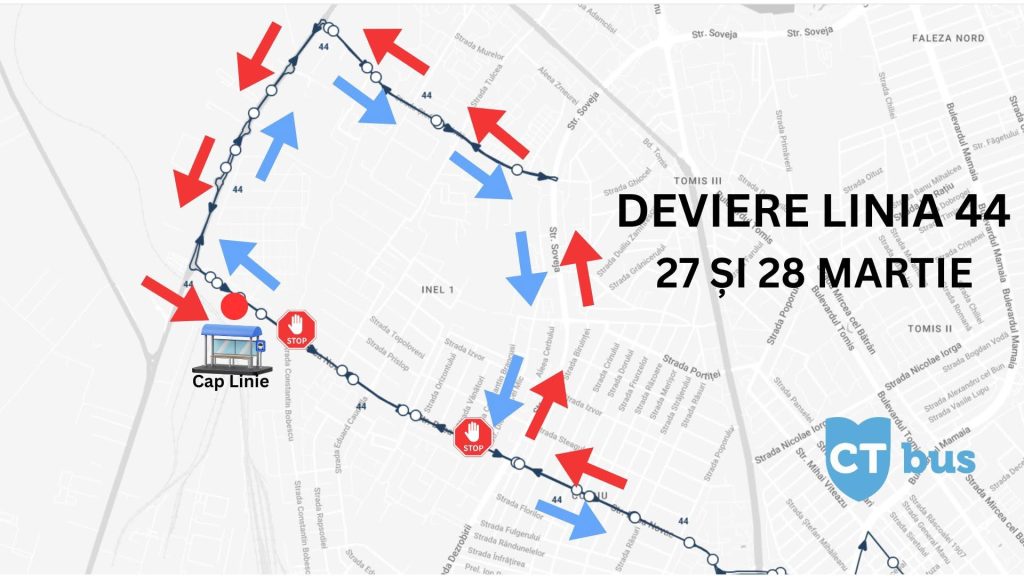 Linia 44 va fi deviată joi și vineri, anunță CT BUS. Măsura vine în contextul unor lucrări de asfaltare pe strada Baba Novac, pe tronsonul cuprins între străzile Soveja și Bogdan Vasile.
