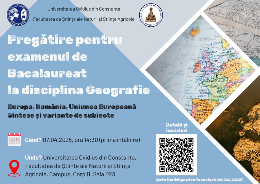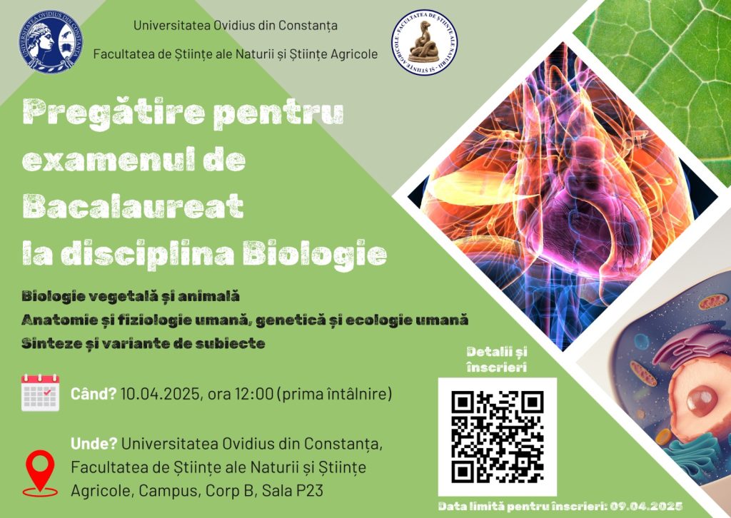 Facultatea de Științe ale Naturii și Științe Agricole (FSNSA) din cadrul Universității Ovidius din Constanța (UOC) organizează, în perioada 7 aprilie – 30 mai 2025, o serie de ședințe gratuite de pregătire la disciplinele Biologie și Geografie, pentru examenul de Bacalaureat 2025.