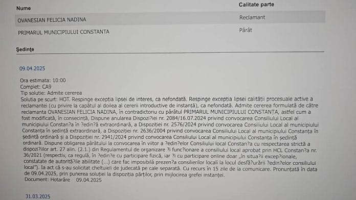 Instanța a admis cererea formulată de Ovanesian și a respins toate excepțiile ridicate de Primărie, inclusiv cea privind lipsa de interes sau lipsa calității procesuale active a reclamantei. Judecătorii au considerat că felul în care au fost emise mai multe dispoziții de convocare a Consiliului Local nu respectă cadrul legal.