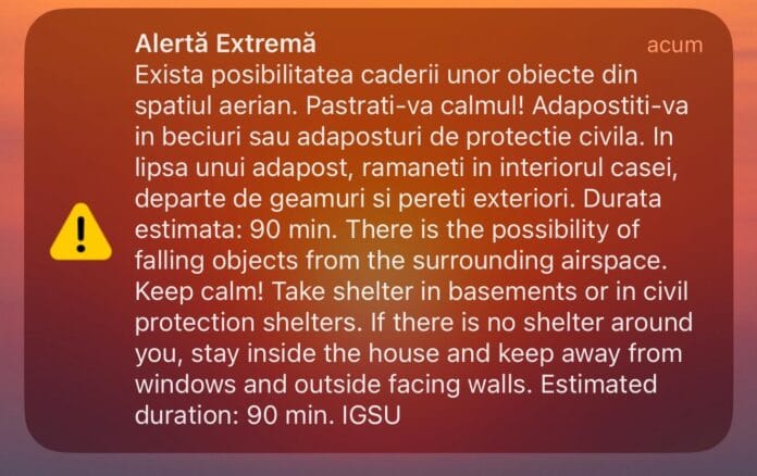 Un mesaj RO-alert a tulburat liniștea nopții, în județul Tulcea, în zona de graniță cu Ucraina. În jurul orei 00:30, localnicii au fost avertizați că există posibilitatea să cadă obiecte din spațiul aerian.