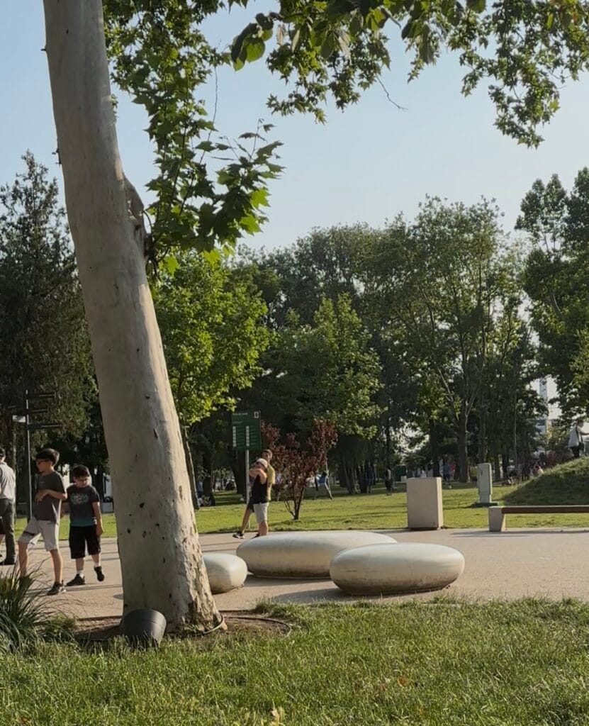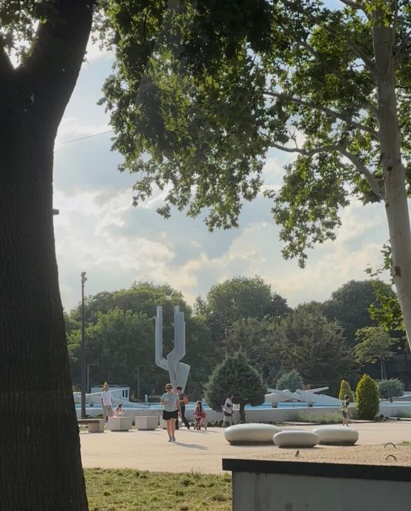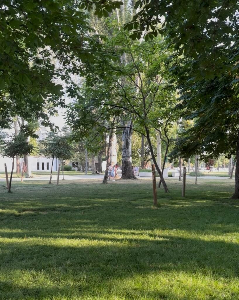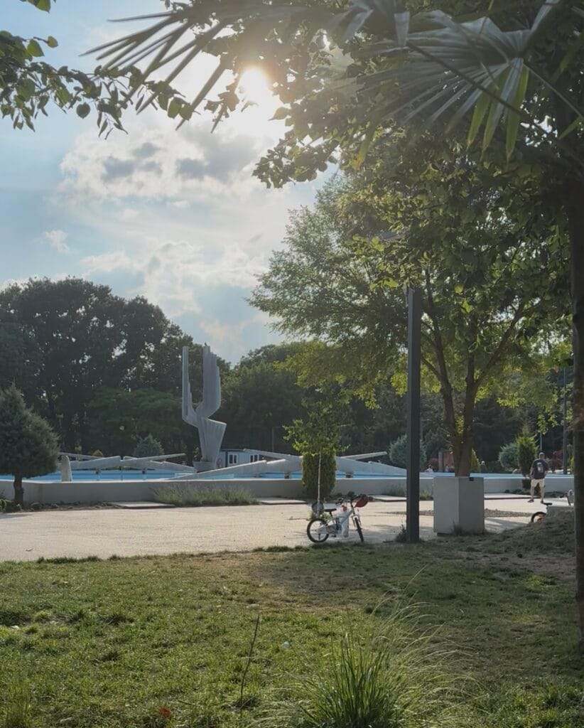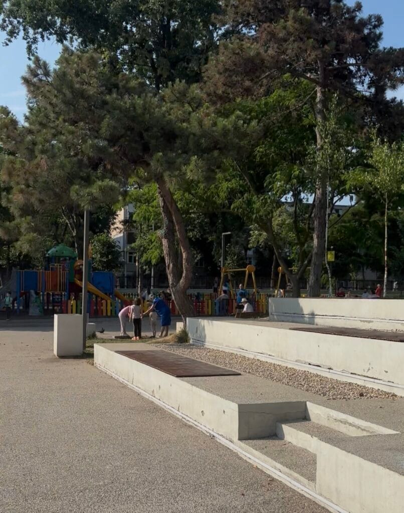 Păcat, pentru că zona este plină de oameni. Unii caută umbra și socializează, alții se relaxează în hamace, în timp ce copiii se distrează la locul de joacă ori dau ture pe alei cu bicicletele ori trotinetele.