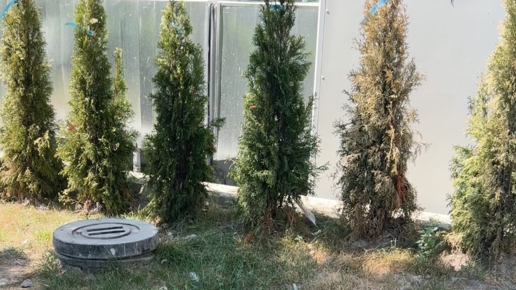 Cei mai mulți tuia sunt uscați și nimeni nu pare să se grăbească să-i ude, deși la doar un metru distanță e un robinet cu apă – sub un capac de plastic. Era nevoie doar de un furtun și 10 minute. Dar nici atât nu s-a putut.
