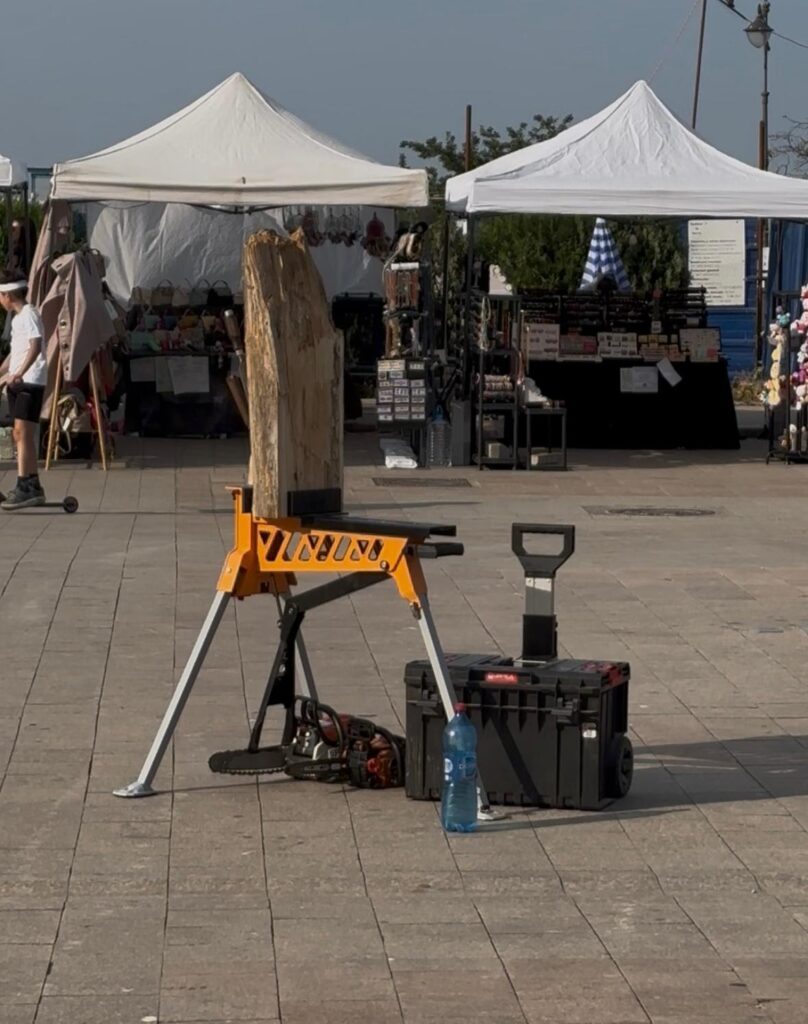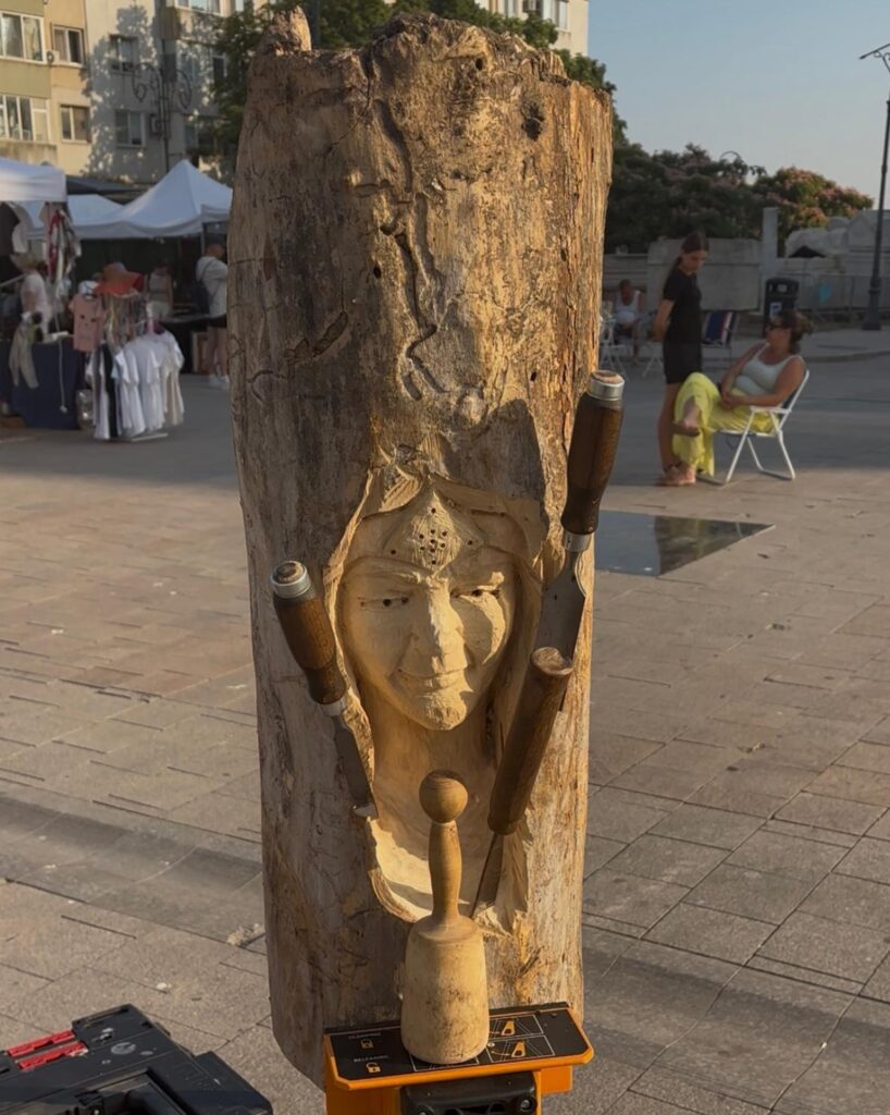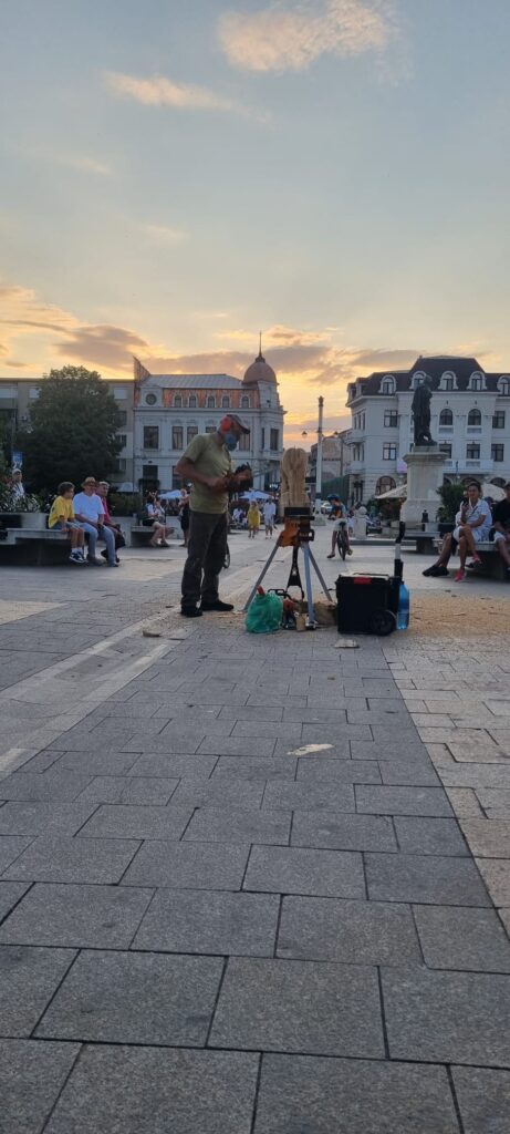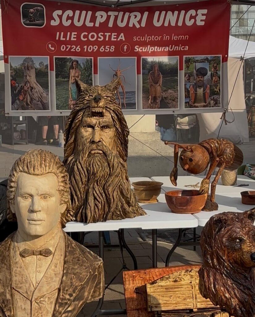 Aseară, unul dintre artiștii prezenți la târg a fost și protagonistul unui spectacol inedit – o demonstrațe de sculptură în lemn, în cadrul căreia nu dalta a fost unealta de rezistență, ci… drujba! Sub ochii trecătorilor, sculptorul Ilie Costea a transformat o bucată de buștean în artă.