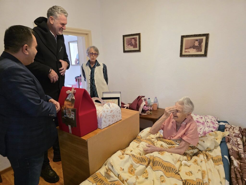 Sărbătorita, care poarta în gesturi și în voce experiența a 10 decenii, i-a primit în camera simplă, decorată cu fotografii vechi și obiecte păstrate cu grijă.
