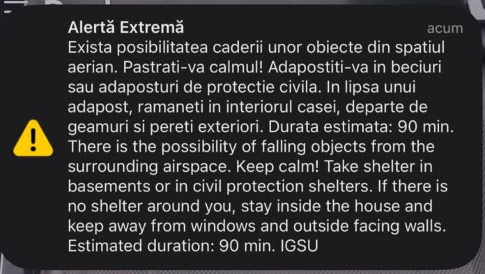 “Mesajul are caracter preventiv și vizează posibilitate căderii unor obiecte din spațiul aerian. În acest context, sunt recomandate măsuri minime de siguranță, precum adăpostirea și respectarea indicațiilor autorităților, în funcție de evoluția situației”, a precizat ISU Tulcea.