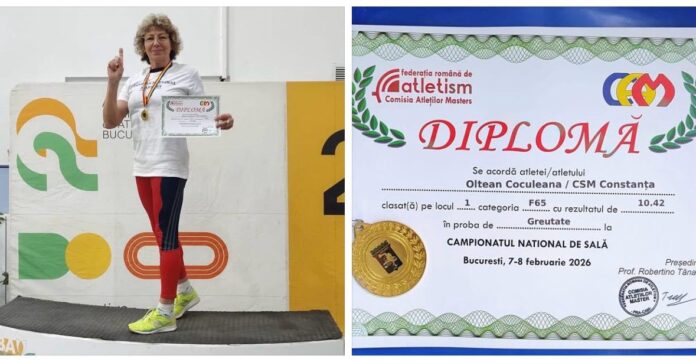 La concursul care a avut loc în sala de atletism “Ioan Soter” din Capitală, Coculeana Oltean a devenit campioană națională la aruncarea greutății, la categoria 65 de ani, cu un rezultat de 10,42 metri.