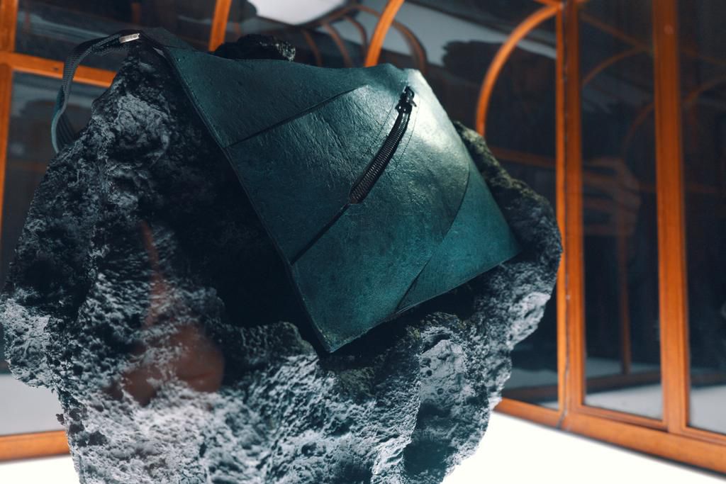 Geanta de culoare albastru-verzui este expusă la Muzeul Art Zoo din Amsterdam, într-o instalație ce include și o replică a unui T Rex.