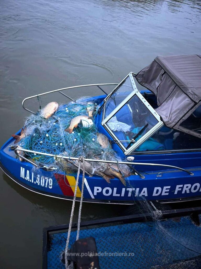 „În data de 23.04.2026, poliţiştii de frontieră din cadrul Punctului de Trecere a Frontierei Midia au identificat două persoane care desfăşurau activităţi de pescuit comercial în Marea Neagră, folosind o ambarcaţiune cu motor. În urma verificărilor, a reieşit că barca avea inscripţionat un număr de identificare fals, acesta aparţinând, de fapt, altei ambarcaţiuni. Totodată, în interiorul acesteia au fost identificate şi ridicate plase de pescuit în lungime totală de aproximativ 460 de metri„, se mai specifică în comunicat.